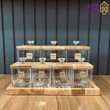 ست بانکه و ادویه کف چوبی شامل ۳عدد بانکه بزرگ درب الماسی و ۴عدد بانکه کوچک و ۴عدد قاشق ادویه و بهمراه پایه چوبی قابل شستشو.